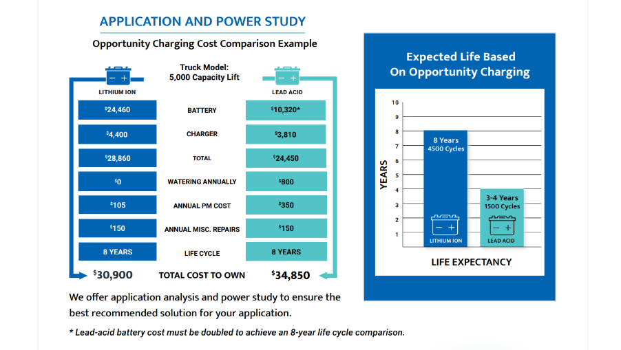 In this example, lithium-ion (battery + charger) is $28,860 versus $24,450 for lead-acid. The difference is lead-acid needs more ongoing care and typically does not last as long under opportunity charging.